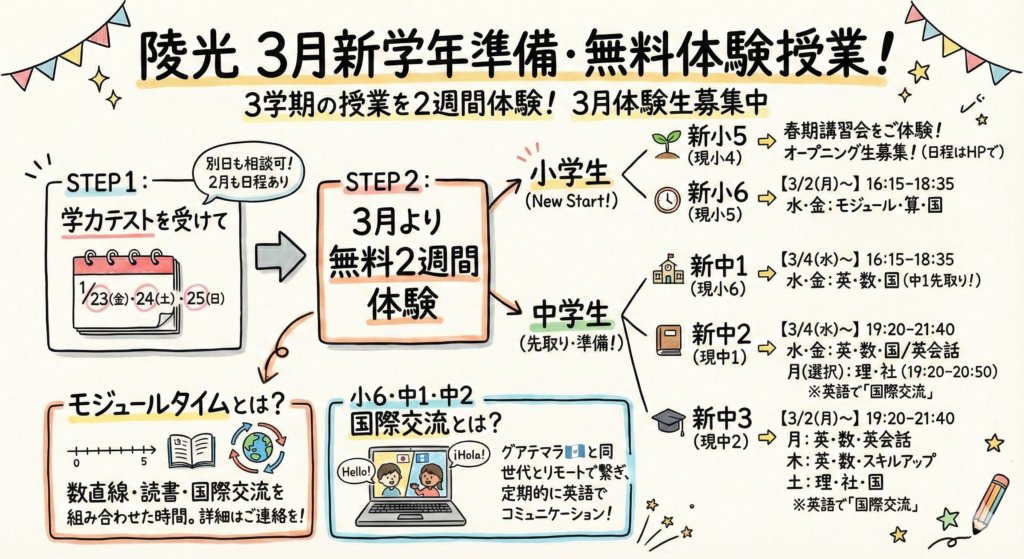 陵光では新学年の準備を3月より行います。3学期の授業を無料で2週間体験してください!